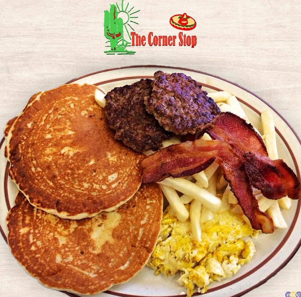 2 pancakes, 2 eggs, any style, bacon or sausage, hash browns, fresh-cut fries, country potatoes, or spicy potatoes.